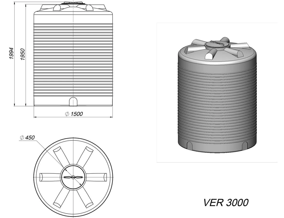 Цилиндрическая усиленная ёмкость VER 3000 KAC призвана помочь в решении задач по хранению и транспортировке больших объёмов достаточно агрессивных веществ и жидкостей. Объём данной цилиндрической ёмкости составляет 3000 литров, что является достаточно вместительным и крупногабаритным резервуаром. По техническим характеристикам усиленные ёмкости VER 3000 КАС имеют высоту - 1950 миллиметров и диаметр - 1500 миллиметров. Стоит учитывать важный момент, относящийся к температуре, в диапазоне которой использование ёмкостей будет безопасно и надёжно всегда: от -30°C до +60°C.