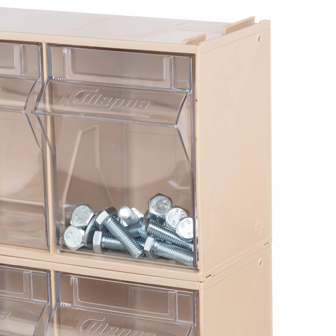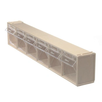 Короб откидной F-600-6-B, 600х96х112 мм, 6 ячеек, бежевый / прозрачный служит для хранения мелкоштучных предметов. Данная система хранения не подвержена случайному опрокидыванию. Откидные ячейки обеспечивают быстрый доступ к необходимым предметам. В случае необходимости полного высыпания или наполнения короб легко извлекается. Полезный внутренний размер каждой ячейки 88х65х70мм.