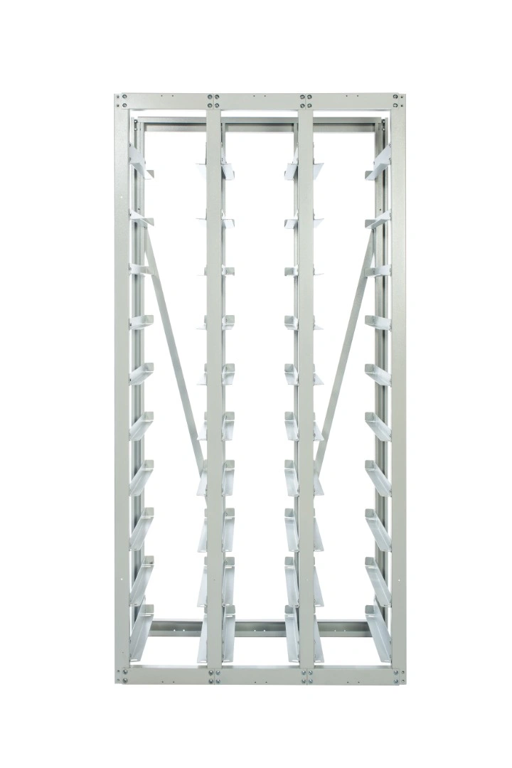 Данная модель стеллажа предназначена для средних размеров контейнеров модели V -3 и способна брать на себя достаточно большие нагрузки до 400 кг распределенной нагрузки на секцию. Стеллаж вмещает в себя 10 ящиков по высоте. Количество по ширине определяется количеством дополнительных наращиваемых секций.