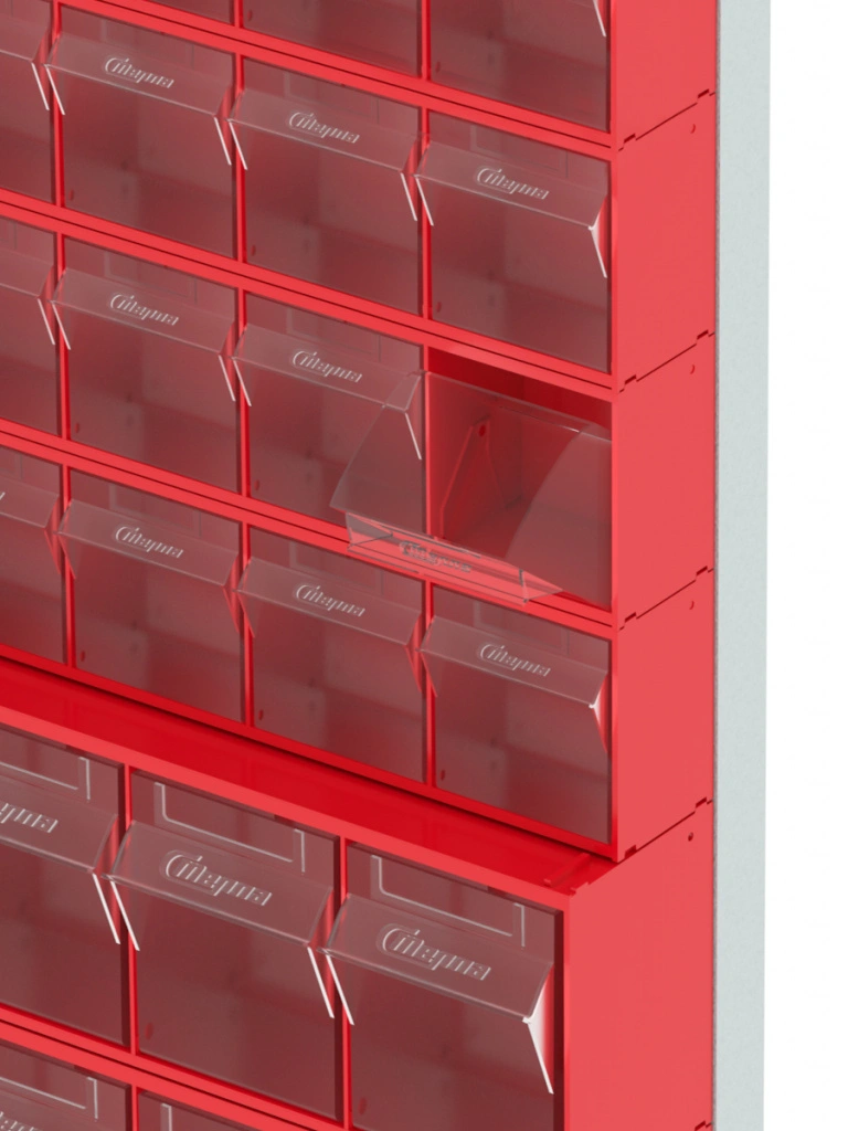Стойка настенная Стелла-техник 402-00-05-03 (610х40х1000) представляет собой удобную систему хранения на основе откидных коробов, которая подойдет для использования в выставочных залах, магазинах, складах. Стойка крепится на стену при помощи саморезов или анкерных болтов (крепеж не входит в комплект и подбирается под уровень загруженности стойки). Комплектация: Рама FOX (610х40х1000) V402 - 1 шт.; Короб откидной Стелла-техник F-600-6 , 600х96х112мм, 6 ячеек, красный, прозрачный – 5 шт.; Короб откидной Стелла-техник F-600-5 , 600х140х168мм, 5 ячеек, красный, прозрачный – 3 шт.; Упаковка. Преимущества: Металлическое основание; Значительная устойчивость; Хорошая вместимость; Длительный срок службы.