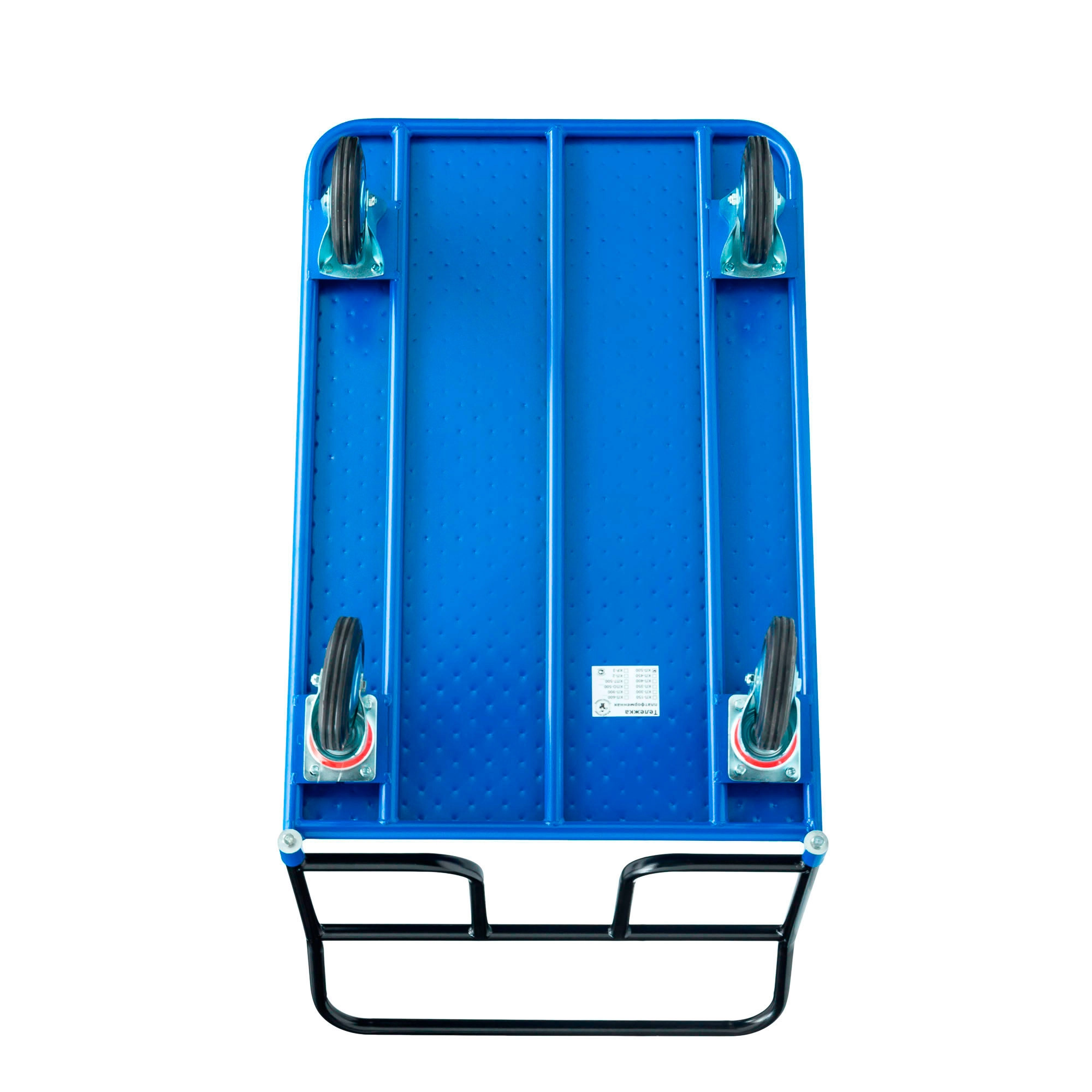 Платформенная 4-х колесная тележка КП-400-160-К используется для перемещения различных грузов в складских помещениях. Ручка крепится к платформе болтами, для компактного хранения можно снять, высота ручки 750мм. Платформа имеет уникальную рельефную, полимерную, противоскользящую поверхность, размером 700х1000 мм. Цвет - синий, шагрень. Для легкого перемещения тележка КП-400-160-К комплектуется двумя поворотными и двумя неповоротными колесами, изготовленными из высококачественной литой резины, диаметром 160мм., комплектом крепежа. Грузоподъемность до 400кг.