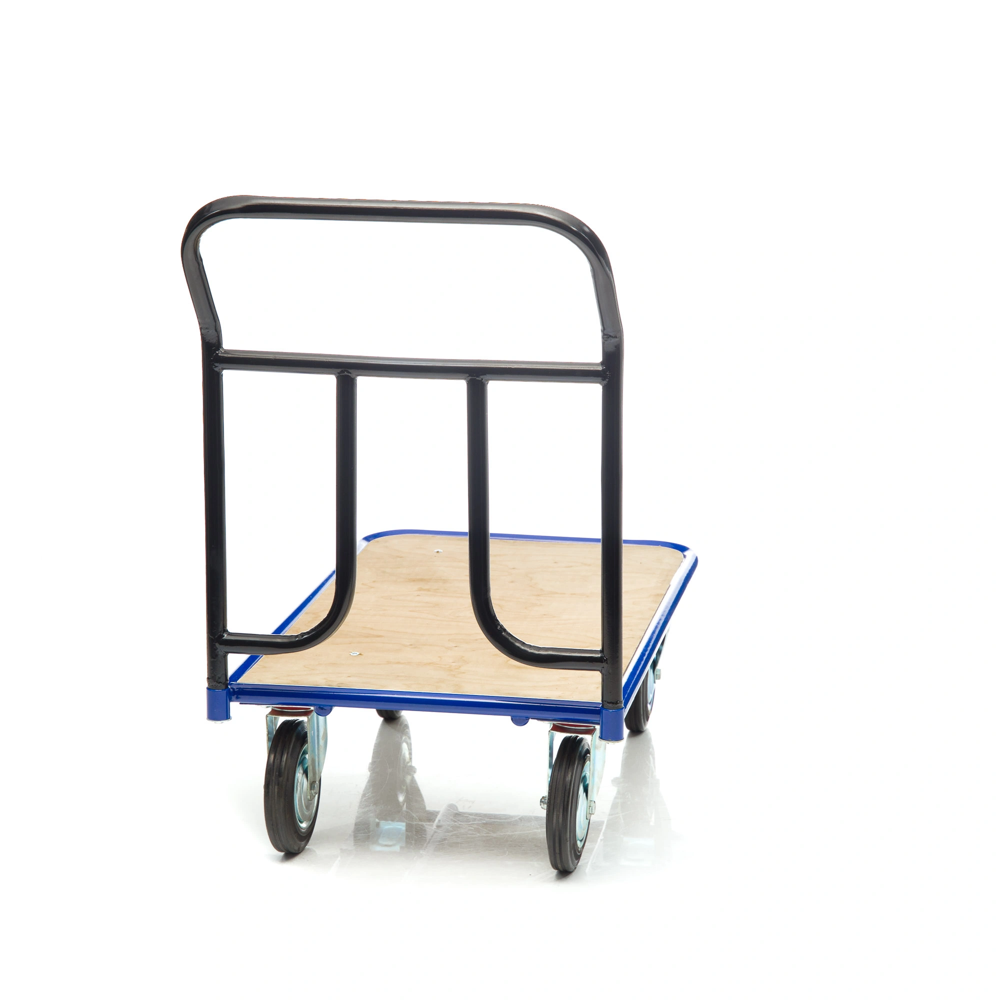 Платформенная 4-х колесная тележка КП-500-150-И (с фанерой) используется для перемещения различных грузов в складских помещениях. Каркас платформы изготовлен из металлической трубы диаметром 28мм., настил из фанеры толщиной 12мм. Размер платформы 600х1000мм. Ручка тележки снимается для компактного хранения. Ручка крепится к платформе болтами. Высота ручки 750мм. Покрытие металлических деталей тележки полимерное. Цвет - синий. Для легкого перемещения тележка комплектуется: двумя поворотными и двумя неповоротными промышленными колесами, диаметром 150мм., из черной стандартной резины, от всемирно известного, ведущего итальянского производителя Tellure Rota, метизами для крепления. Платформа с основанием из фанеры, обеспечивает устойчивое положение груза во время транспортировки. Легкая, малогабаритная тележка применяется на складах, в торговых павильонах, возможно использование и в бытовых целях. Грузоподъемность до 450кг.