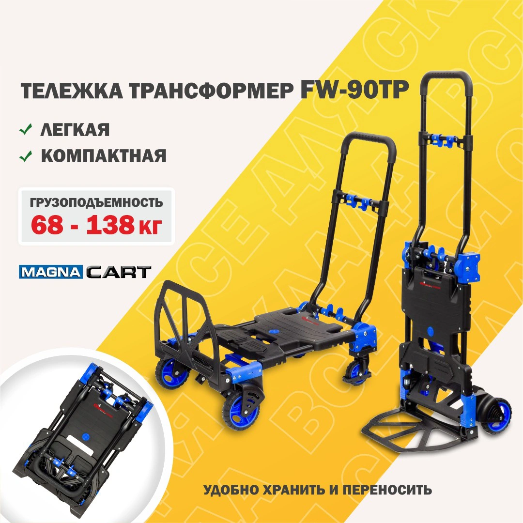 Тележка трансформер MagnaCart FW-90TP складная универсальная тележка предназначена для работы с разного рода грузами. Тележка может использоваться как двухколесная, при необходимости трансформируется в четырехколесную тележку и может использовать в наклонном варианте. Складные тележки идеально подходят для транспортировки выставочного оборудования, обслуживания маленьких складов и перевозки грузов в домашних условиях или во время путешествий. В сложенном виде, за счет компактных размеров тележку можно легко разместить в багажнике машины. Ручка стальная с термопластичной резиной. Платформа - PP (полиуретан). Откидная платформа - сталь. Колеса из термопластичной резины: 2 малых диаметром 90 мм и 2 больших диаметром 125 мм. Высота ручки в рабочем состоянии: в четырехколесном платформенном варианте минимум 685 мм, максимум 920 мм, в двухколесном варианте минимальная высота 1100 мм, максимальная 1340 мм. В двухколесном варианте тележка может перевозить грузы весом до 68 кг. В горизонтальном положении на четырех колесах грузоподъемность тележки до 138 кг. Габариты тележки в сложенном виде 416х450х110 мм. Собственный вес тележки 7,3 кг.
